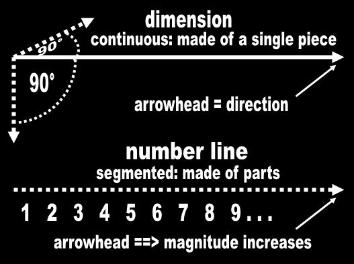 In Physics, a dimension is conceptually made of a single piece (direction) and is nothing without the other two (orthogonality is a requirement). We tentatively draw a solid line to reflect this In Math, they have no use for dimensions. They use number lines which the idiots of Mathematics call dimensions and later attempt to relate to physical dimensions in their dissertations. The number line of Math has no direction (it is a segmented concept). It only has magnitude. Thus, we tentatively illustrate a number line with a dashed arrow. the arrowhead does not indicate direction. It indicates that numbers increase. |