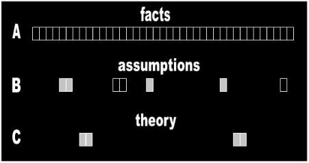 A. Fact: A movie of everything that occurred: the entire Cosmic Movie. B. Statement of the Facts (prosecutor); Assumptions (juror): Objective evidence (clear frames) and subjective testimony (filled frames). C. Theory: Film clip of some of the missing parts of the Cosmic Movie. Prosecutorial inferences founded on evidence and testimony (statement of the facts). This movie is an abbreviated version of select film clips of the facts. The prosecutor is proposing that this is what may have happened (or why) because it follows from the assumptions and evidence. The prosecutor is filling in the blanks. |