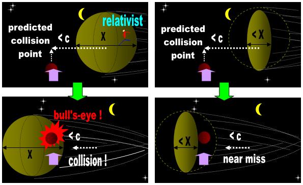 cosmetic, the large comet does NOT contract in actuality and the little comet crashes into it, squashing the naïve relativist. (Sorry! I just couldn't resist pulverizing him!) Right: If the larger comet contracts in actuality as predicted by relativity, the collision never happens. |
