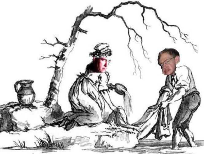 | Gimme back my pants, you stupid woman! Don't you know anything about relativity? The pants are going to contract if you wash them that fast! |