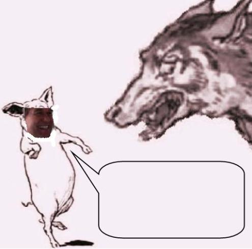 | Nyah, nyah, you caaan’t hurt me! You can huff and puff and blow all you want, wolfie! Al and Steve told me that I’m protected by an energy field! Ha, ha, ha, ha, ha! |