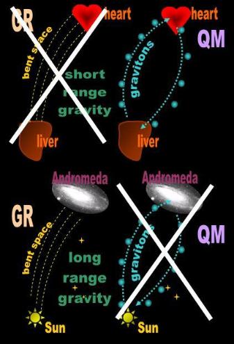 Fig. 1 GR (macro world) and QM (micro world) explanations for gravity as applied to each other. |