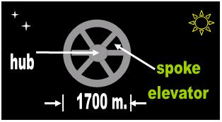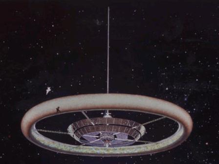 The torus is designed to house 10,000 people, who live around half the wheel. The other half is allocated to food pro- duction. The torus rotates to generate artificial gravity, so feet and plant roots point radially towards space. Elevators running along the spokes take people to the hub (where there is no gravity). This is the arrival point for travelers (i.e., the airport). |