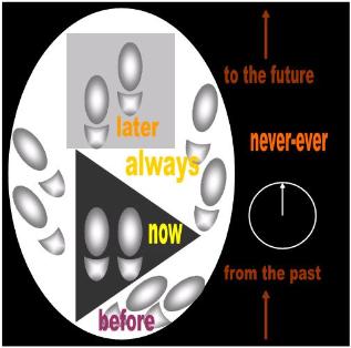 a. that the 'nows' henceforth be triangular like the 'heres', the justification being that it would thus have the same shape as a 'here' b. the 'laters' should be like the 'theres' and be squarish c. the omni-present 'always' like the omnipresent 'everywhere' should be circular d. the 'nevers' like the 'nowheres' should be non-dimensional e. the 'befores' should look like ginger- bread men... |