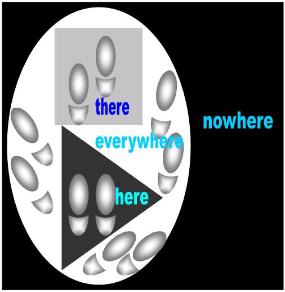 Weyl proposed that a point is a 'here and now.' I think that this was a brilliant idea. In order to distinguish the 'heres' from the 'theres' from the 'everywheres,' however, I would like to modify his theory a little. I propose that we make the 'heres' like triangles, the 'theres' like squares, the 'everywheres' like circles, and the 'nowheres' dimensionless. |