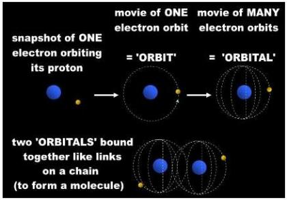 | Bohr had his electron orbiting a nucleus. They called it an orbital in those early days of Quantum. Clark's cloud model has the electron orbiting the nucleus many times. He calls this movie an orbital. The H2 molecule no longer consists of two interlinking rings. Now it consists of two merged regions, energy levels, fields, or whatever. |