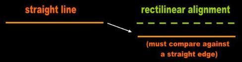 The adjective straight has at least two requirements. One is that it must qualify a physical object. The other one is that this object must be continuous: made of a single piece. For the purposes of Science, rectilinear is an adverb. This word cannot be used to qualify objects. It may only be used to modify a series of objects or displacement of one object. The individual is in effect placing a straight edge next to a series of objects or locations. |