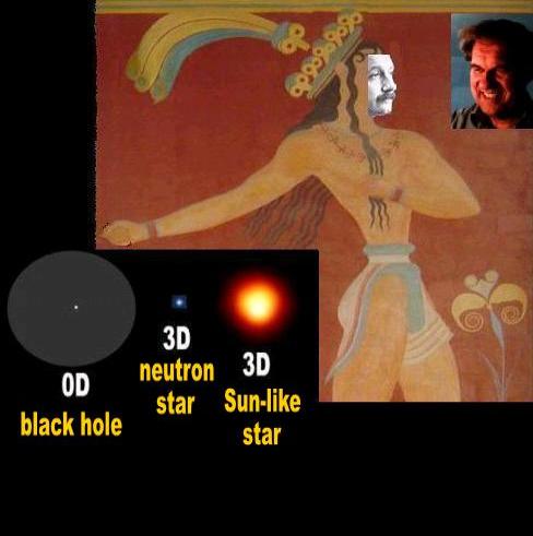 | This is a 3-D star like our Sun, Bill. If a star has a lot of mass, it turns into a tiny 3-D neutron star like this little blue one. And if it has more mass, it turns into a 0-D black hole like this third one. |
