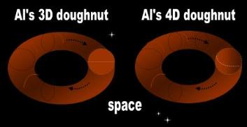 Relativists allege that a 2D plane moving through the ‘dimension’ of time scans and thus ‘constructs’ a 3D object. Thus it is that a 3D solid moving through or growing in time paints a 4D space-time. The following ‘gedanken’ experiment refutes both these claims. Al’s doughnut is a film, not a still photograph! |