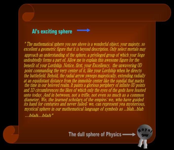 A relativist ‘explains’ a sphere and nevertheless ends up with absolutely nothing. The sphere of Mathematical Physics consists of a bunch of zero-dimensional points or 1D curves equidistant from a center. When a relativist is finished with his explanation, there is nothing to see. The mathematicians may claim that this is their version of the sphere, the one they use in their discipline. No problem! But then, this is not a geometrical object and cannot be used in Physics! |