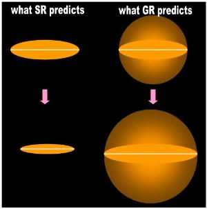 | SR predicts that the diameter of a sphere will shrink if it travels at near-c. GR predicts that the same volume of space will expand due to inflation. So which is it? |