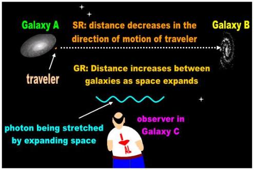 | According to SR, the distance between the traveler and Galaxy B decreases the faster he goes. According to GR, the distance between Galaxies A and B ncreases due to cosmic inflation. A photon is also stretched by this spatial expansion. This photon-stretching version contradicts the explanation general relativists give for Olbers’ Paradox, which holds that the reason photons from stars don’t reach us has to do with the fact that space increases between us and the photons. If the photon stretcheslike a rubber band together with space, the light from all the stars should be upon us, and the official explanation for Olbers’ Paradox is absolute bunk! The reader should also factor in that the mechanics claim that we have photons going from atom to atom within our bodies! If photons stretch, so should our bodies! You should be exploding as we speak! |