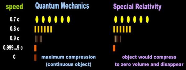 | SR predicts that particles of matter flatten out in the direction of travel and vanish altogether at c. QM predicts that maximum compression of the object is a function of the size of its indivisible components. So we encounter a contradiction in Mathematical Physics. Relativists are required to answer in addition: |