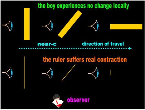 flattens out only in the direction of travel, the boy should notice this as much as any distant observer. This means that if the