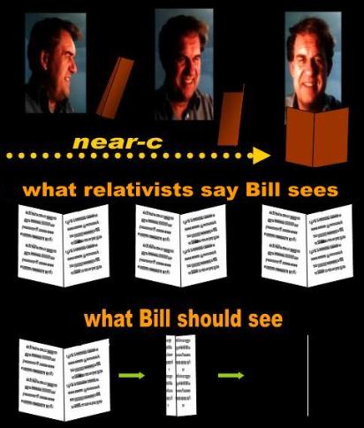 Bill is reading a book while swiveling in his chair. He is in a rocket traveling at near-c. SR claims that an extrinsic observer should measure that Bill and his book contract in the direction of travel. But then Bill should also see his book contract when he swivels perpendicular to his direction of travel. The fact that both Bill and his book are in the same frame of reference has nothing to do with the justification relativists provide for why either contracts. The book should contract only in the direction of travel. Both Bill and an extrinsic should see the same thing. Bill is an observer with respect to his book, frame or no frame of reference! What's the frame of reference got to do with the instant explanation if the justification for contraction is the speed of light in a given direction?