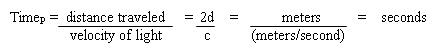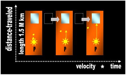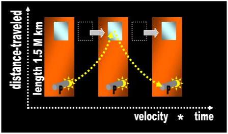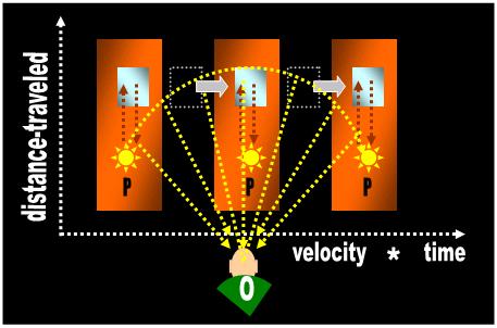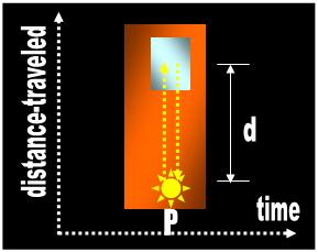 | The passenger (P) points his flashlight at the mirror and light travels this distance roundtrip. The passenger measures the distance (d) as if the beam described a rectilinear itinerary. In the Monastery of Relativity, the monks equate static distance (a photograph) with dynamic distance traveled (a movie). In the foregoing equation, TimeP is the time measured (with a clock) by a passenger traveling on the train. Since the passenger does not perceive motion, his measurement is no different than if you took the measurement in your house (motionless scenario). |