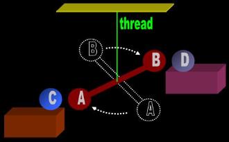 | Heavy spheres A and B are initially balanced on a thread and allowed to stabilize (dotted dumbbell). Then, spheres C and D are placed nearby. As if by magic, C attracts A and D attracts B. (You can watch the experiment here.) Knowing the torsion on the thread and other parameters, Cavendish was able to estimate the gravitational constant G. |