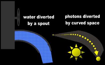 | According to relativity, gravity is a static, geometric phenomenon. Einstein replaced Newtonian force with curved space. This explanation makes the scenario of light traversing curved space no different than the scenario of water running down a curved spout or hose. Water will simply follow the contour of the medium. Likewise, if light travels through a region of space where there is a gravity-well, it will be redirected along the contour of space. Mass and acceleration have nothing to do |
