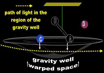 | As a wave climbs out of the Earth’s gravity field, the mathematicians are able to measure a decrease in frequency in only 22 meters! They explain that gravity affects electromagnetic waves. However, in relativity, gravity is geometry: curved space. In relativity, the gravity well (warped space) bends the beam. Any way we look at it, the HTE shows that distance traveled by a wave, the length of the wave, its speed, and its mass, as well as the acceleration or mass of extrinsic objects are irrelevant to the issue of measuring the bending of light. Relativity 'predicts' that a photon should never travel rectilinearly anywhere in the Universe. (I have drawn the gravity wells in both directions to satisfy yet another duality invoked by relativists.) |