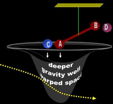 | Relativists explain that A moves closer to C because both lead sinkers warp the space around them. More massive objects have deeper wells, which implies steeper drops and stronger gravitational attractions. In order for C to influence A the mouth of its well must as a minimum reach as far as A to compel this sinker to drift towards C. Hence, the radius of a well represents the distance range of gravitational influence whereas the depth of the well represents the mass. As A moves closer to stationary sinker C, the gravity-well distorts and moves with it. Hence, as two objects are drawn together their wells merge and increasingly act as a single object. The radius of the well thus formed is slightly longer and the well is deeper. Relativists claim that a gravity-well deflects a stream of photons from their path. The steeper the well, the greater the degree of deflection. Compare the skewed path of the ‘photon’ before and after the sinkers meet (exaggerated here for a crisper visual effect). |