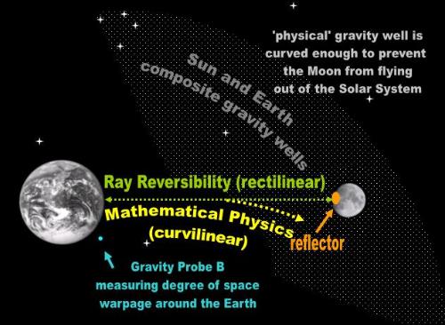| According to the PRR, light travels rectilinearly from the Earth to the Moon and back to origin. GR 'predicts', instead, that a photon will be deflected by warped space, the same warped space that the idiots of NASA's GPB program just finished measuring. Assuming that the photon by chance strikes the reflector, it should never arrive back on Earth. If it does, this falsifies relativity's 'prediction' that space is curved. |