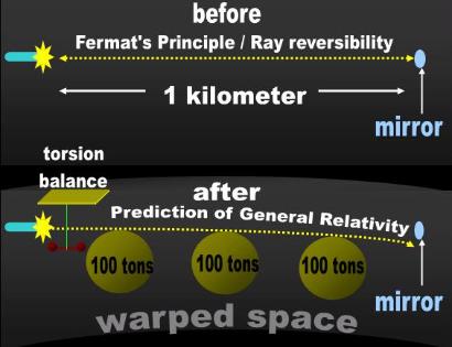 | We point a laser at a very tiny mirror in the distance and receive a rectilinear reflection consistent with the Principle of Ray Reversibility. If relativity’s curved space/gravity well explanation has any merit, we should be able to roll a couple of 100-ton spheres arbitrarily close to the beam and generate a new gravity well in its vicinity. This warped space should deflect the beam just enough for it to miss its target. We verify that the 100- ton mass has a strong gravitational effect on objects in the vicinity by hanging a dumbbell (for example a relativist) from a thread near the sphere and performing a torsion balance experiment. I predict that the dumbbell will swing across the straight beam and debunk relativity. |