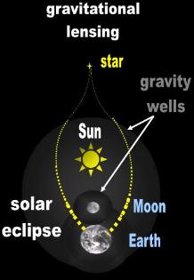 | Eddington took pictures during the solar eclipse of 1919 and allegedly confirmed one of relativity’s key 'predictions': that a stream of photons is deflected from a rectilinear path by warped space. Relativists proclaim this to be an important milestone in a series of ‘confirmations’ of relativity. It enables them to claim that gravity is the result of geometry. |