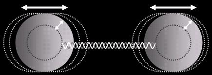 | In order for the EM rope to remain straight, an unbound atom vibrates and induces the one at the opposite end of the rope to vibrate as well. It is important to keep in mind that vibration (long arrows) is a different phenomenon than pumping (short arrows). An atom pumps while it vibrates. |
