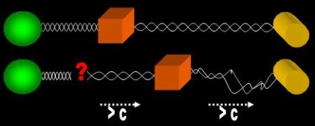 | An EM rope binds any two atoms. Light is the result of EM rope torque. Its speed is limited by (c = ƒ * λ). Gravity is the result of the exponential pull of countless ropes as two objects approach each other. For simplicity, in the following scenario we see only two of these ropes. If the cube were to travel towards the cylinder at > c (i.e., faster than the signal torquing along the rope), we should expect the rope at the rear of the cube to break and the rope in front of it to loosen. Light and gravity would disintegrate. Proponents of FTL travel would have to show how they intend to increase frequency without shortening the wavelength. |