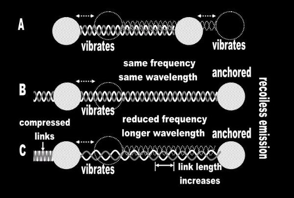 B. Mössbauer Effect Scenario 1. One atom is anchored and the other slides along the rope like a bead along the wire of an abacus. Therefore, wavelength and frequency remain the same. C. Mössbauer Effect Scenario 2. One atom is anchored and the other stretches the rope. Here, the wavelength increases at the expense of frequency (i.e., the links become longer). |