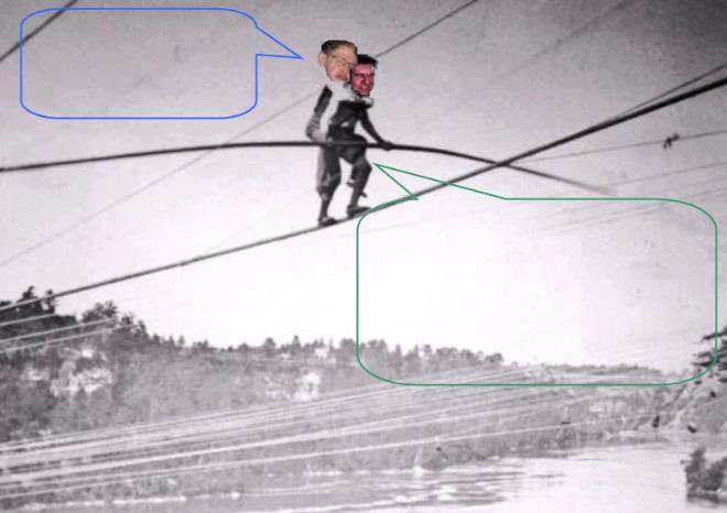 | I can't go any faster because my motion is independent of the tightrope. You’re, uuuggh, choking me, Steve! It’s the last time I piggyback a relativist across the river! |