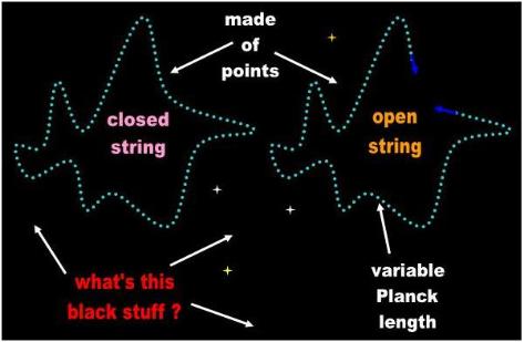 | The string of String Theory is a magical entity that embodies every possible contradiction. Theorists proclaim a string to be the tiniest length imaginable, but then the string stretches as necessary to accommodate any theory. The string is purportedly under tension, but then, it is a malleable entity that grows, bends, coils, and forms closed and opened loops to suit the theorist’s wishes. According to the mathematicians, the string is one-dimensional: it seems to have only width. But then it encroaches on other dimensions when it vibrates or loops around. To top it off, string theorists claim that the vacuum that serves as a backdrop and gives shape to the string is also made of strings. Oh. I almost forgot. String Theorists are asking anyone with a generous heart to finance an experiment that would enable them to see a 1-D string and thus prove their theory. [Sure! Why not? Here’s a nickel! Catch!] |