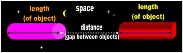 | The word 'length' refers to the continuous matter lying between two surfaces of ONE object. The word 'distance' refers to a region devoid of matter: to the space that separates TWO surfaces. Length is to matter what distance is to space. Both length and distance are conceptually static. |