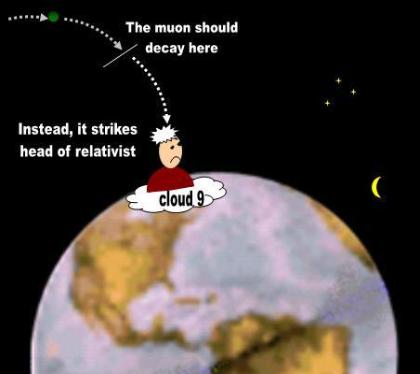 | QM has ‘proven’ that a particle known as the muon has a lifetime of 2.2 μs. This is not enough time to cover its trajectory from cradle to grave. Relativists explain this paradox as ‘distance’ contraction. From the speeding muon’s perspective, the distance in its direction of travel decreased. Another way they state it is that the medium through which they travel (in this case the atmosphere) contracts. Think of the Pacific Ocean. Relativists say that If one fish could swim at near-c, the entire Pacific would shrink to nothing! China would be part of the U.S. Australia would bump against Chile and Peru. The mathemati- cians claim that these results are consistent with Special Relativity's |