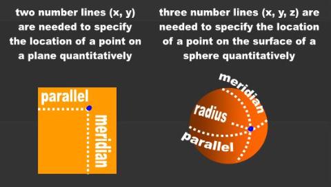 The mathematicians require two number lines known as parallel and meridian to quantita- tively specify a location on a plane, for instance on a rectangle. The mathematicians require three number lines known as parallel, meridian, and radius to specify a location on a sphere. For unknown reasons that the psychiatrists are still researching, the mathematicians never include the radius. This in spite of the fact that they define the sphere as having a center. In the religion of Mathematical Physics, a sphere is not 3-D, but rather 2-D.