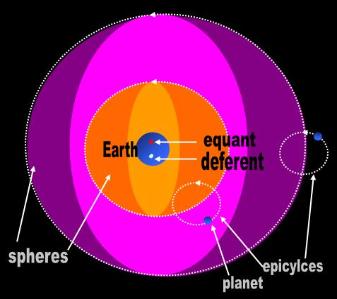 | A planet moves around a fixed point on an embedded, rotating sphere. Here I show only two such spheres with their respective epicycles. Imagine swinging a ball at the end of a string while you ride on a rotating carousel. The center of the carousel is the Earth. The ball revolving around your hand is an epicycle. Ptolemy and others devised this comical system to explain what they observed when they looked at the night sky. To explain more subtle phenomena, they went further and developed deferents and equants, concepts which essentially mean that the Earth was slightly off center within the spheres. |