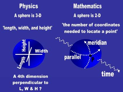 | Since the days of Descartes, the idiots of Mathematical Physics have confused number lines for dimensions. The mathematicians use parallels and meridians and call them coordinates or dimensions or whatever. To make matters worse, they routinely leave out the 3rd (physical) dimension, the one they call radius or diameter. They call it height, and replace it with a number line called time. This is how they arrive at the ridiculous conclusion that a sphere is 2-D. The sphere later magically morphs into a 4-D geometric figure when the mathematicians attempt to convince you that you live within a concept called space-time. These misconceptions have only to do with semantics. The mathematicians are not using their definitions consistently. |