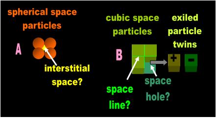 | The assumption that space is comprised of particles carries with it the implication that there is a backdrop A. What should we call the interstitial regions between spherical space particles? B. What delineates and gives shape to each cubic space particle? What remains behind when the accelerator rips particle pairs from the fabric of space-time? |