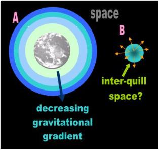 | A. If gravitational field = space and the gravitational gradient drops as we move away from the Earth, what has changed in the constituents of space? Have they become smaller? Less massive? B. If electric field = space and straight electric field lines diverge farther from the charge, what do we propose to call the ‘space’ between the lines? |