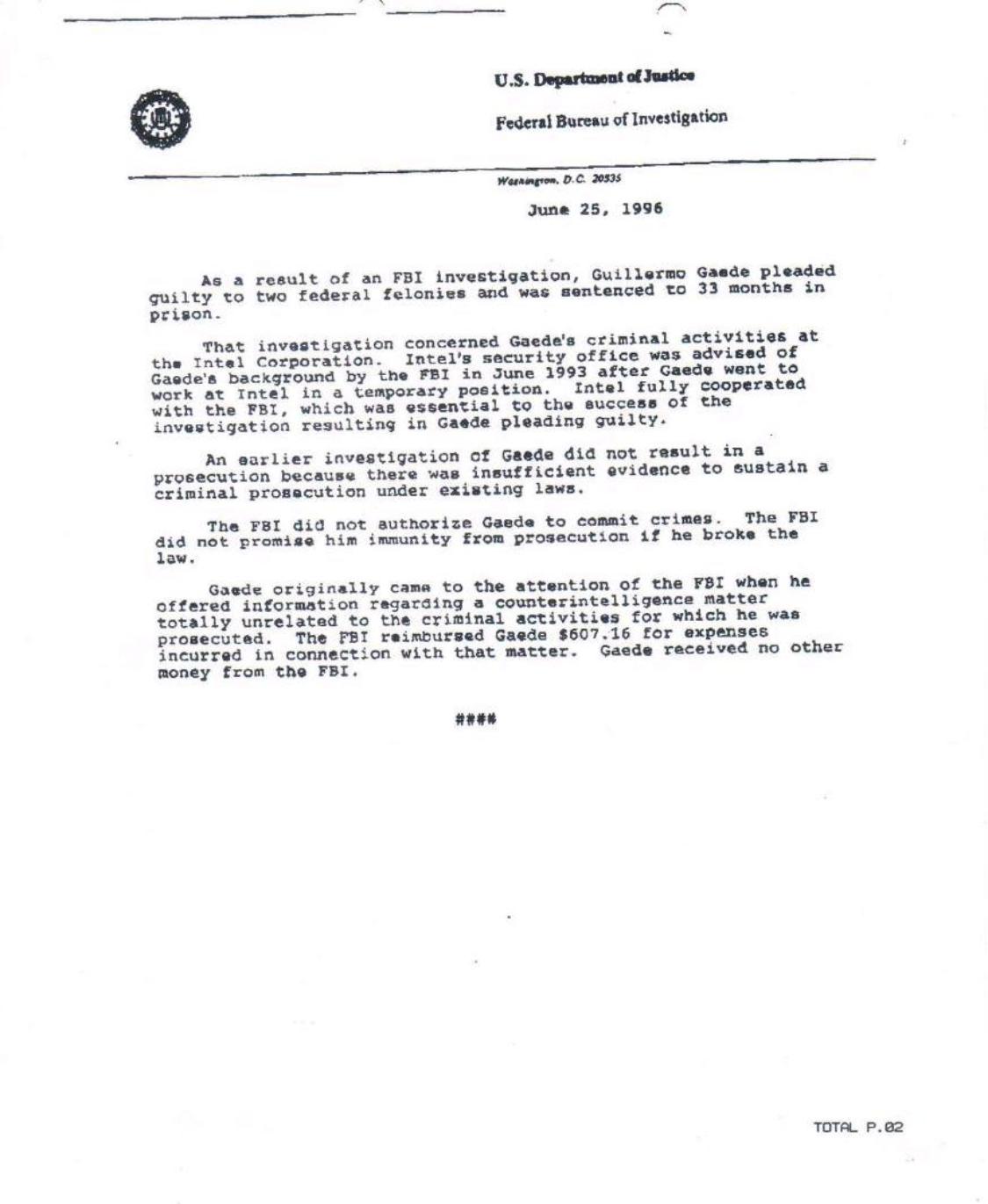 | Comunicado de prensa del FBI donde dice que estaban trabajando conmigo en una operación de contraespionaje y que me pagaron. |