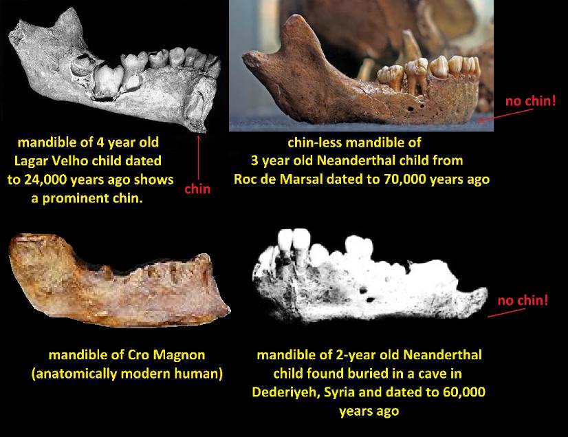 A readily visible difference between AMH and Neanderthals that allows even non-experts tell them apart is that Neanderthals lacked a chin. So called experts such Trinkaus and Zilhao apparently don't seem to know the basics of their trade if they concluded that the Lagar Velho child is a Neanderthal hybrid. |